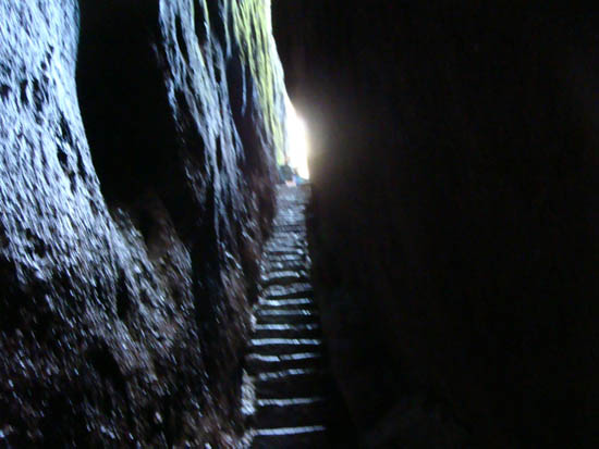 在伏羲洞中观赏一线天,沿石罅右行约数十步,就可以折入风洞。凉风从石罅中习习吹来,即使是盛暑时节到此,稍坐片刻,也会感到肌骨透凉。洞口石壁上的"风洞"二字,十分醒目,为宋徐自强所书。出了风洞,再绕过一道石廊,就是灵岩洞了。相传先前有个姓葛的仙人,曾在此降妖,故此洞又称葛仙洞了。洞内有一口古井,叫圣水井。